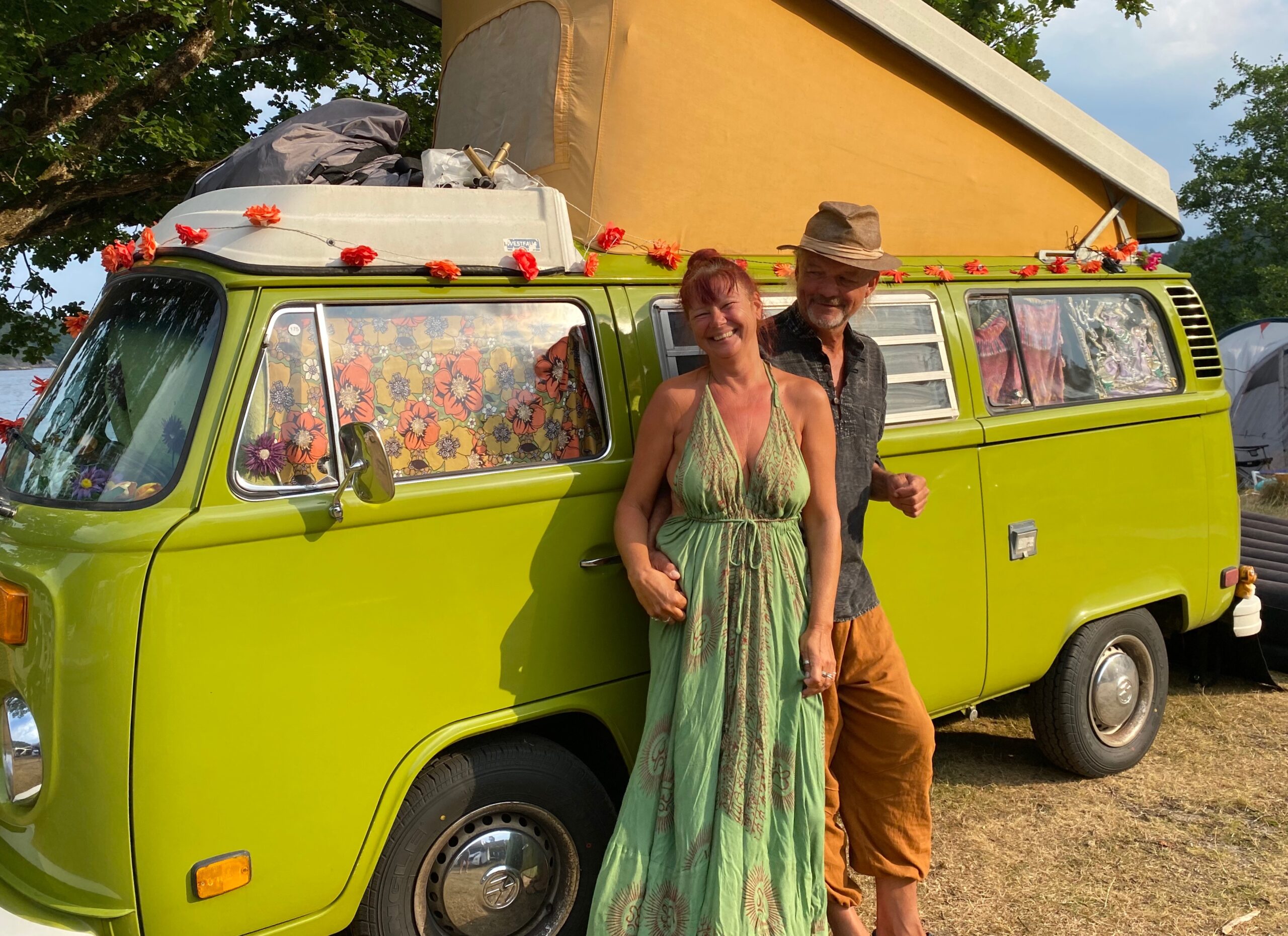 – Det første året vi reiste til Roskildefestivalen sammen, bodde vi i telt. Men vennegjengen vi reiste sammen med har Volkswagen transportere – denne typen busser, alle sammen. Det var det som var starten. De var på oss hele tiden, om at vi ikke kunne bli med dem i en vanlig bil. Det var litt gruppepress nesten, forteller Helge Hummervoll, godt supplert av Liv Elin Aas. Hun kalles forresten for Lea, er en kreativ sjel og glad i farger, særlig farger som forbindes med 1970-tallet.