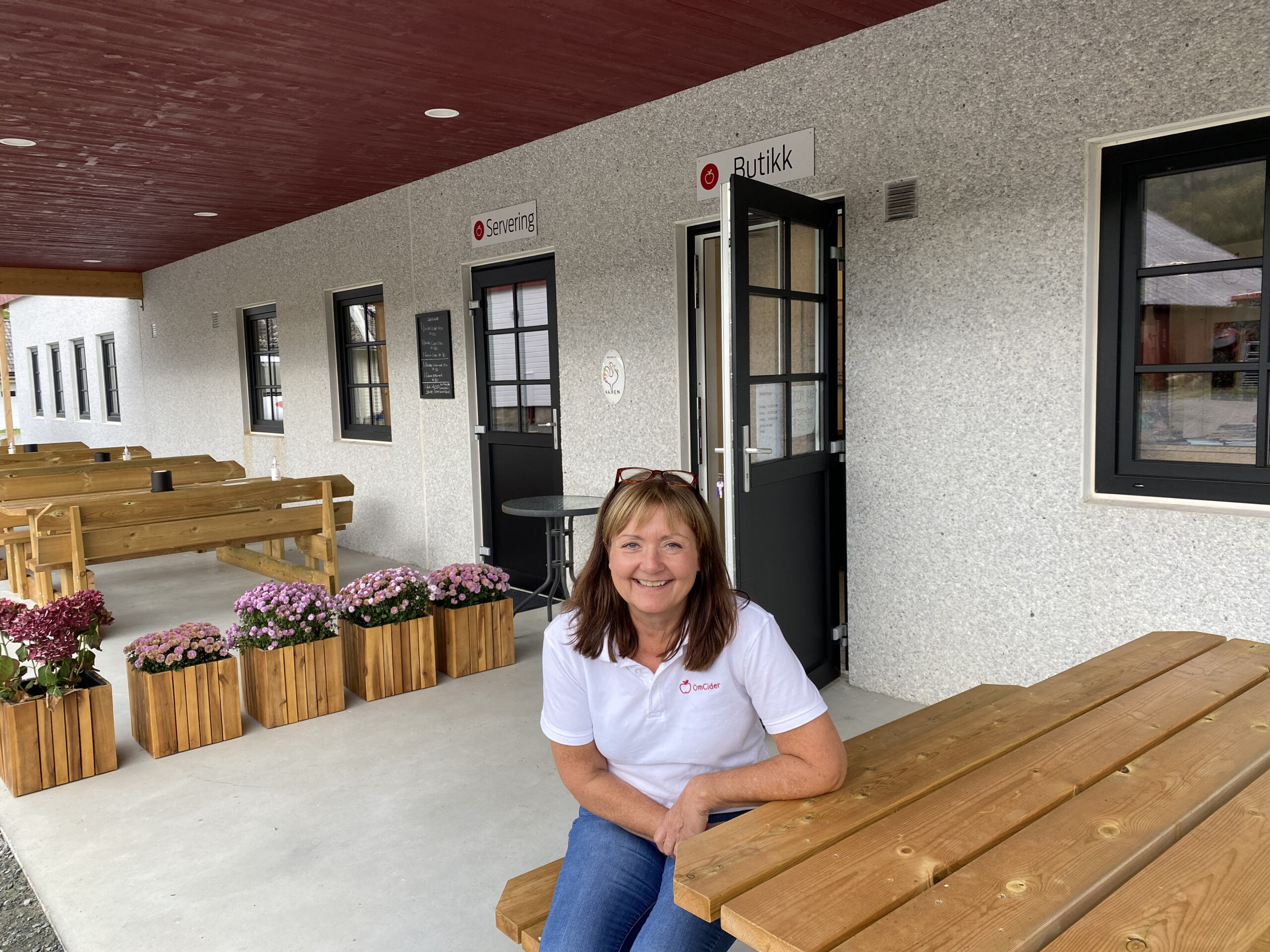 Bodil Kvame tar imot gjester og kunder i gardsbutikken på Fevoll gard, produsenten av OmCider.