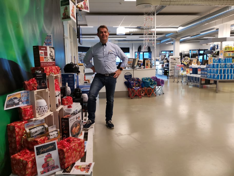 Torgeir Undheim har ansvar for utstyrsbutikken, som er pyntet med stjerner, lys og julegaver.
